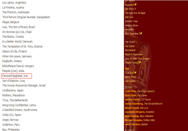 نام فیلم سینمایی بدرود بغداد (نماینده سینمای ایران در اسكار 2011) در فهرست فیلمهای خارجیزبان اسكار 2011 ثبت شده است.