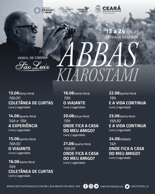 عباس کیارستمی، فیلمساز ایرانی که به شدت تحت تأثیر نئورئالیسم ایتالیایی قرار گرفت، طی بیش از ۴۰ سال فعالیت، کارنامه حرفهای درخشانی از خود بر جای گذشت و در بیش از ۴۰ فیلم به عنوان کارگردان، فیلمنامهنویس، تدوینگر، تهیهکننده و فیلمبردار حضور یافت. چهار فیلم بلند و پنج فیلم کوتاه از این کارگردان در سالن سینمایی قدیمی «سائو لوئیز» برزیل به نمایش گذاشته خواهد شد که از آن جمله میتوان به فیلمهای «خانه دوست کجاست؟»، «زندگی و دیگر هیچ» و آثار کوتاه «نان و کوچه»، «تجربه» و «مسافر» اشاره کرد.